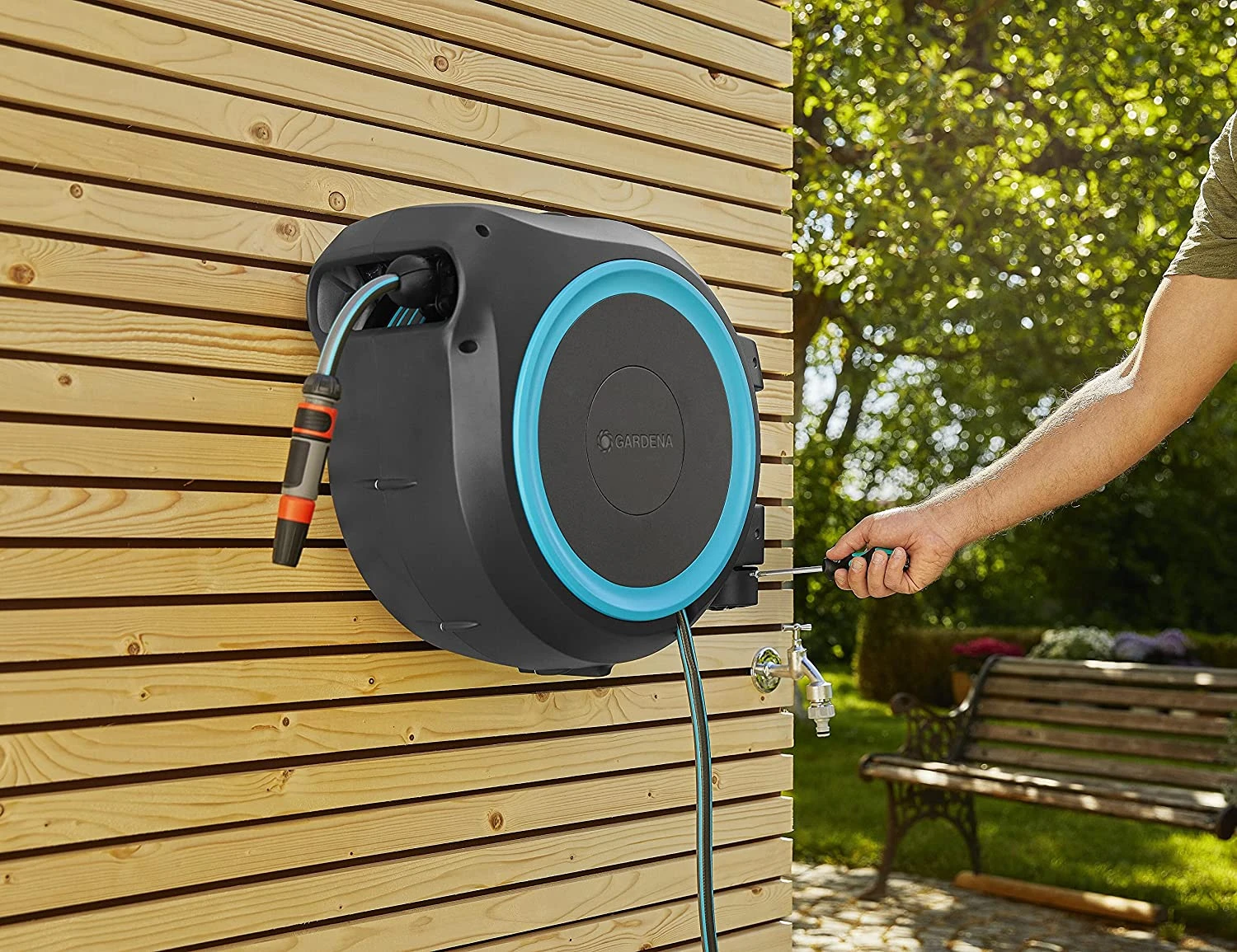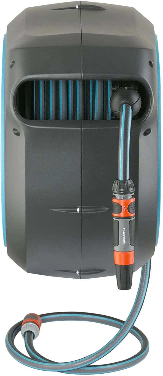 - Watering that’s always ready for action: With the help of the Wall-Mounted Hose Box RollUp M/L, watering your garden becomes a comfortable pleasure. This Wall-Mounted Hose Box saves you from tiresome winding, dirty hands and a tangled hose. Mounted on any wall, your garden hose is stored safely and is extremely space-saving. For use, simply pull out the 25-metre hose to the desired length. As soon as you stop, the extra short locking points grip and secures the garden hose. Thanks to the practical wall bracket, the hose reel can be swivelled through 180° and follows your movements in the garden unnoticed. In this way you can easily do your watering work, have maximum freedom of movement and the hose does not kink. No bending or winding is necessary to roll up the hose: a light pull on the end of the hose is enough to release the lock. The high-quality steel spring inside the box then rolls the hose up automatically, reliably and evenly for you. The innovative RollControl technology ensures safe and controlled retraction. Thanks to the integrated hose guide, there are no knots or kinks when rolling up the hose, preventing damage to the garden hose. With the tap and hose connections from the Original GARDENA System you can flexibly extend the hose or attach other GARDENA Watering Attachments. Your GARDENA Hose Attachments are always ready to hand: they can be attached underneath the wall bracket and be stored there to save space. The high-quality material is protected from various types of weather by both UV and frost protection and can therefore be used all year round. The box is equipped with theft protection. The hose box comes with all necessary connecting parts: wall bracket, a connecting hose, all necessary Original GARDENA System and Assembly Parts as well as a nozzle with two different spray jet options. GARDENA gives a five-year warranty on the high-quality hose storage