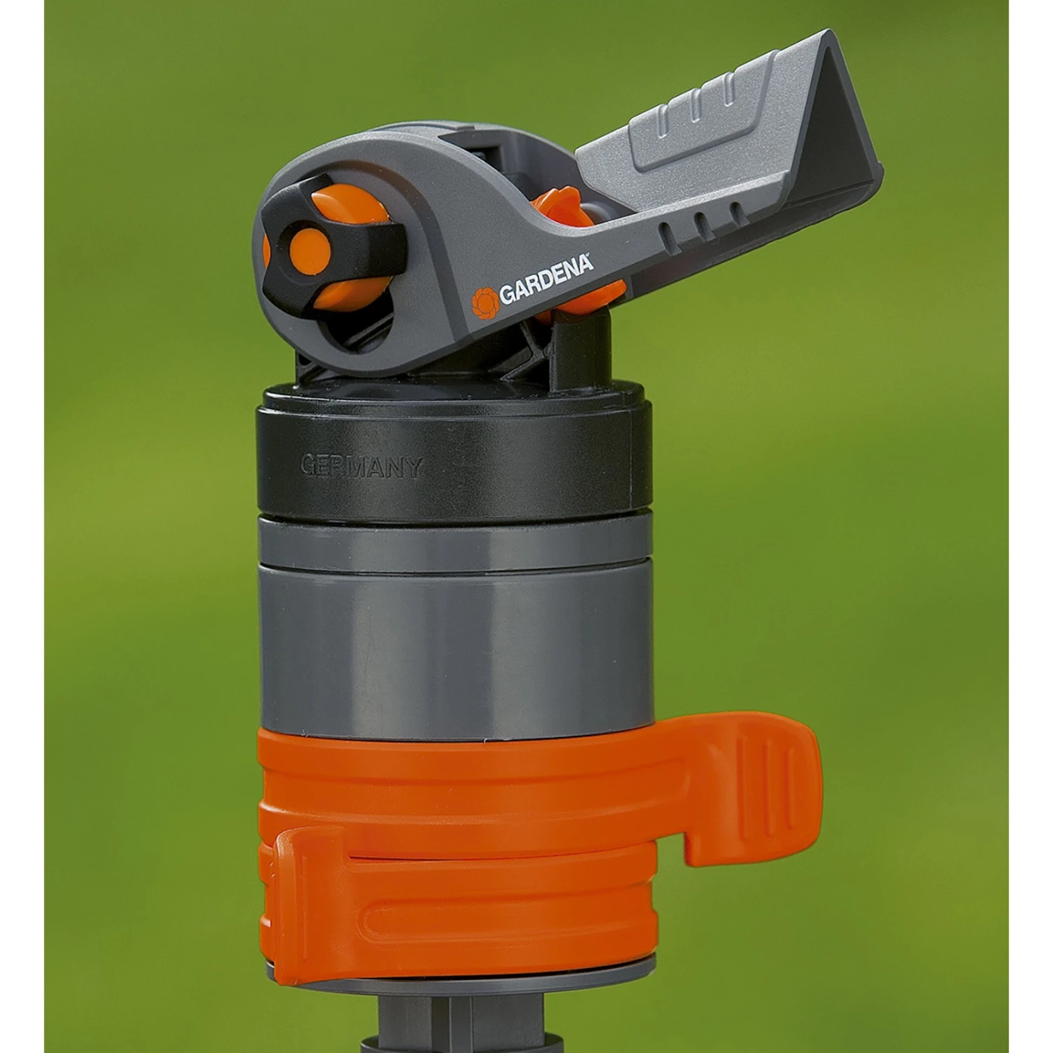 - With the GARDENA Comfort Turbo-Drive Sprinkler, you can quietly irrigate your lawn. It is made of sturdy plastic and is thereby very low-noise. The dirt-resistant, turbodrive gear is patented. The sprinkler is equipped ready-to-connect with the GARDENA System Connector and an end cap. If you would like to water a larger area, simply connect several sprinklers using the GARDENA Tap Connector (18201)