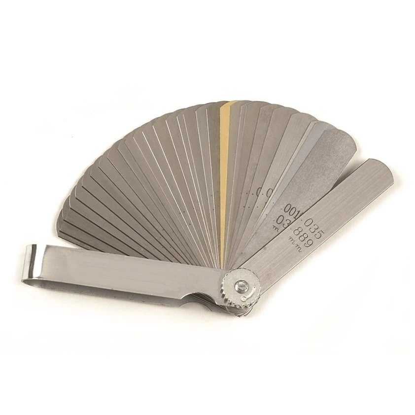 - Feeler Gauge Sizes SAE0.0015,0.002,0.0025,0.003,0.004,0.005,0.006,0.007,0.008,0.009,0.01,0.01 (Brass),0.011,0.012,0.013,0.014,0.015,0.016,0.017,0.018,0.019,0.02,0.021,0.022,0.023,0.024,0.025,0.026,0.028,0.03,0.032,0.035