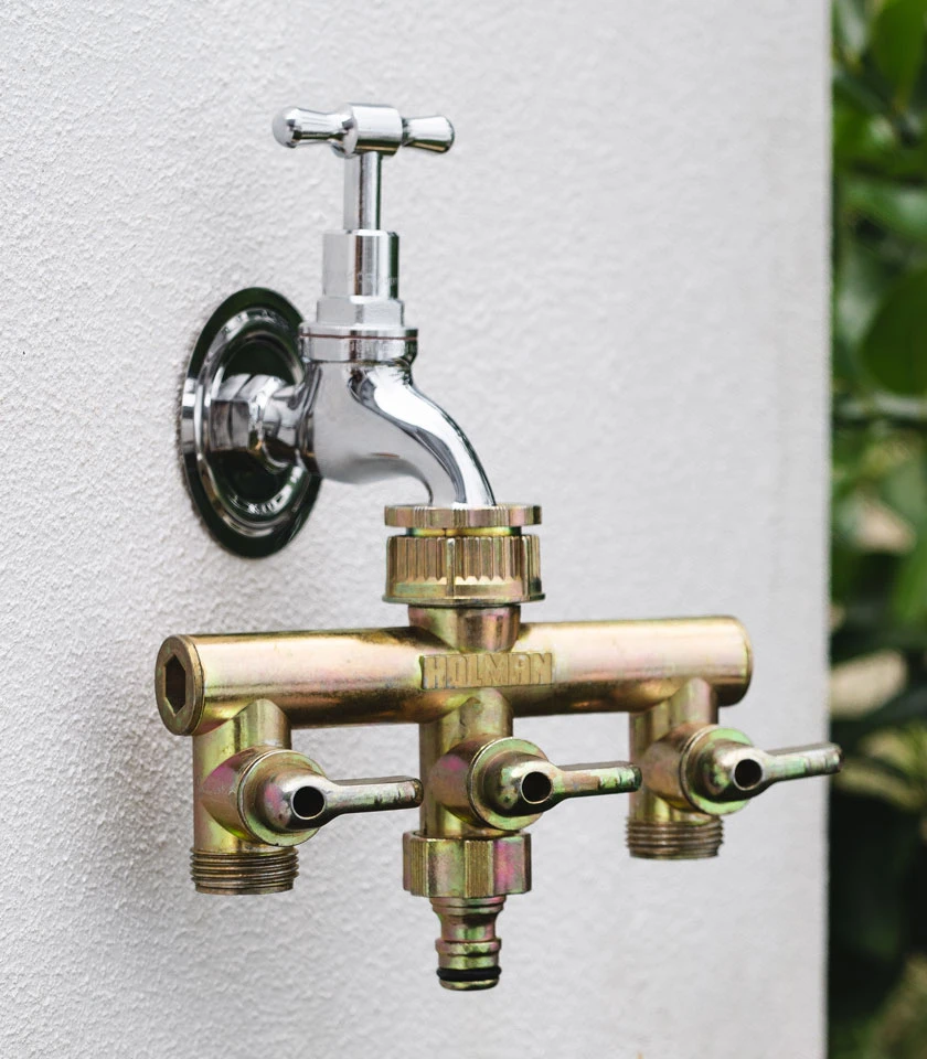 - It turns one tap into three! The Holman 3 outlet metal manifold converts one garden tap into four independent manually operated outlets. It’s ideally suited for connecting to garden hoses, dripping/porous hoses, poly pipe or inline drip systems