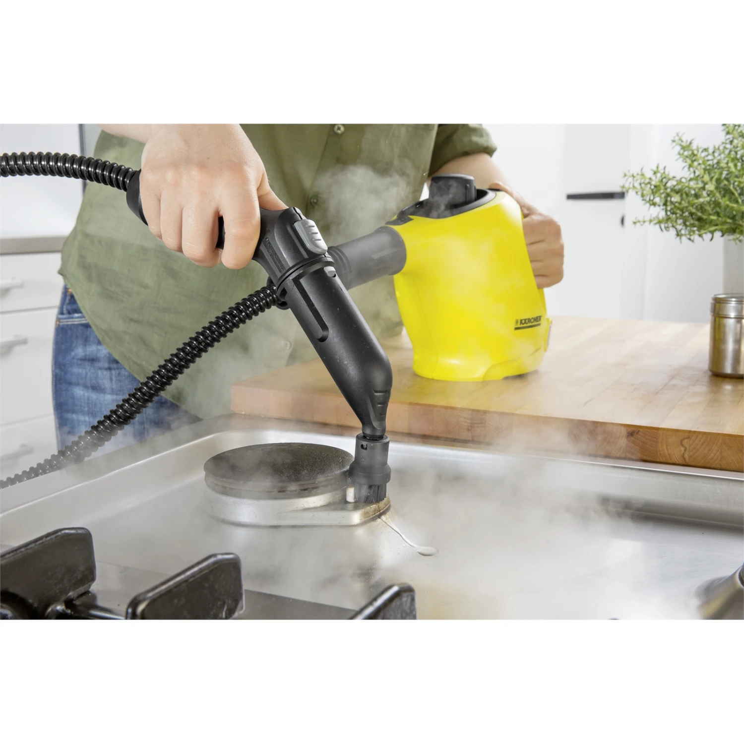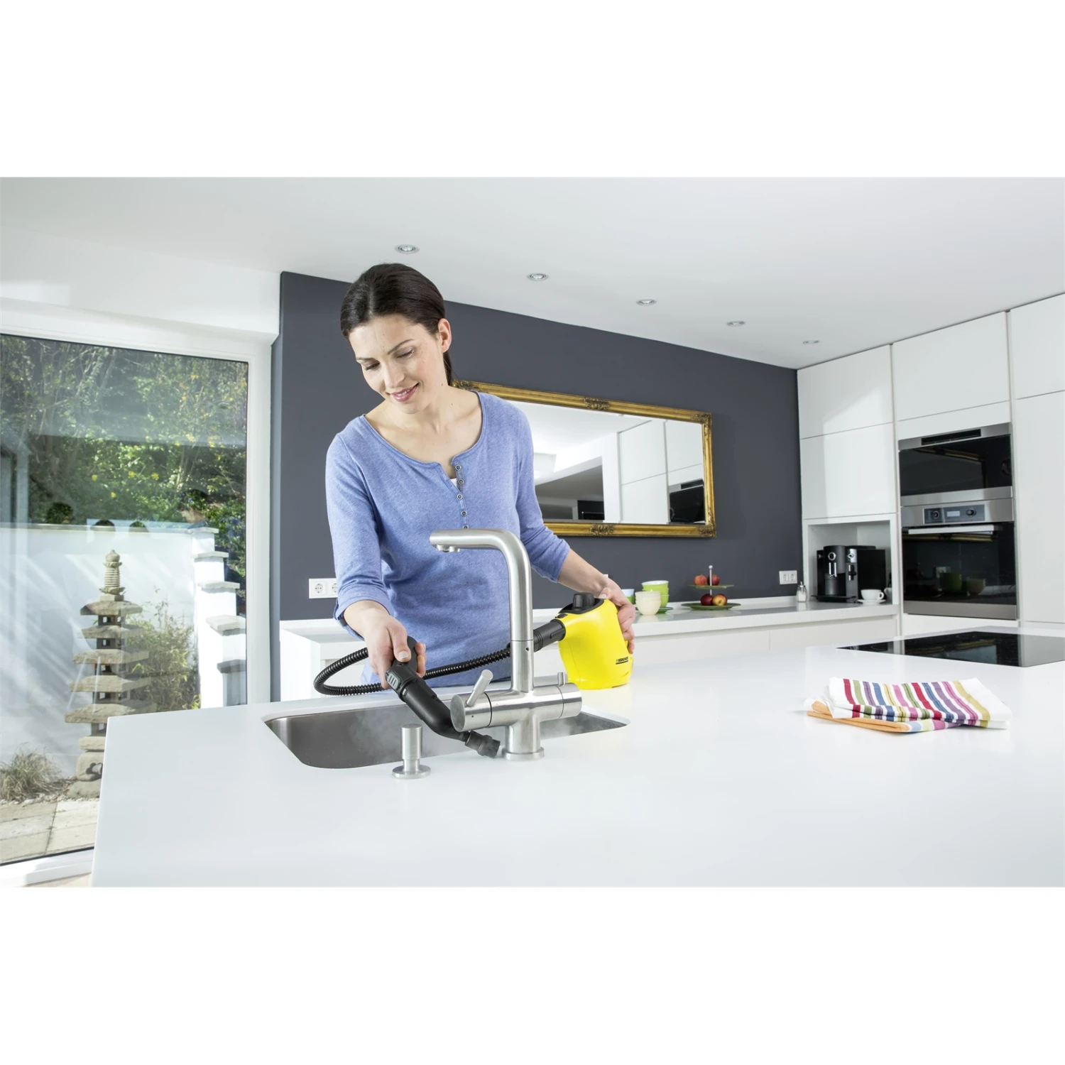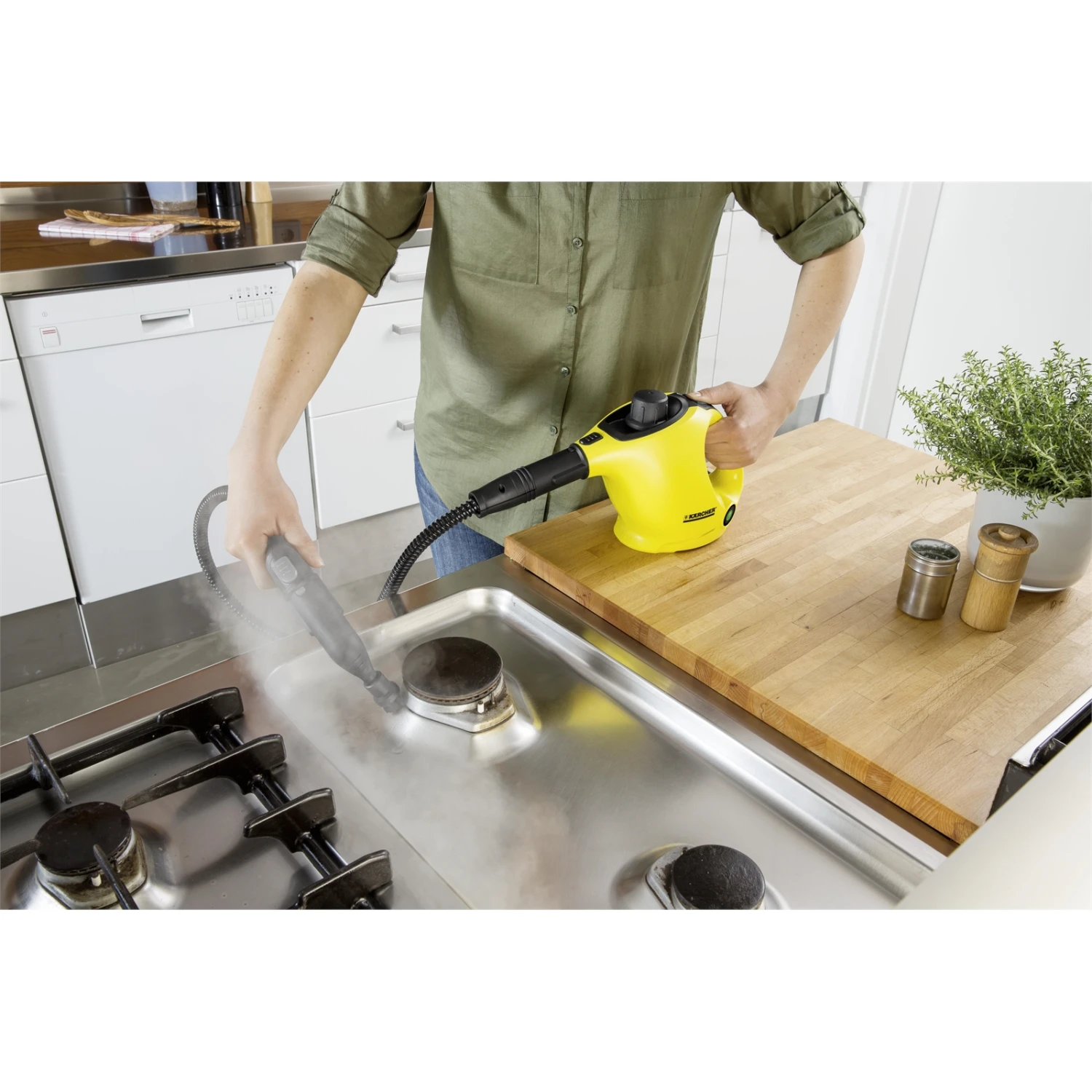 - The compact SC 1 EasyFix Premium 2-in-1 steam mop cleans without using any chemicals. The device is excellent for cleaning common household hard surfaces such as fittings, tiles, hobs and exhaust hoods. With the extension hose, which is included in the Premium package, even hard-to-reach corners, cracks and niches can be cleaned perfectly. Thorough cleaning with the Kärcher steam cleaner removes 99.99% of all common household bacteria from common household hard surfaces. Even stubborn dirt and grease deposits are eliminated in no time. Thanks to the floor nozzle EasyFix in the accompanying floor kit, the handheld steam cleaner can be converted for floor cleaning in no time. The compact and handy device is ideal for straightforward intermediate cleaning and also allows for especially space-saving storage