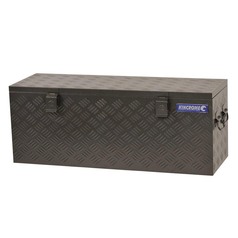 The Kincrome Tradesman Truck Box features a butt hinged lid with internal reinforcing for added strength, dual lid gas struts, side carry handles, bolt cutter resistant security latches and pre drilled base mounting holes with optional rubber feet. The Tradesman Truck Box is made from strong welded chequer plate steel and has been finished in UV stabilised Hammertone powder coat for rust and scratch resistance. Ideal for the Tradesman, Utes, Trucks, Job Sites, Garage & More…