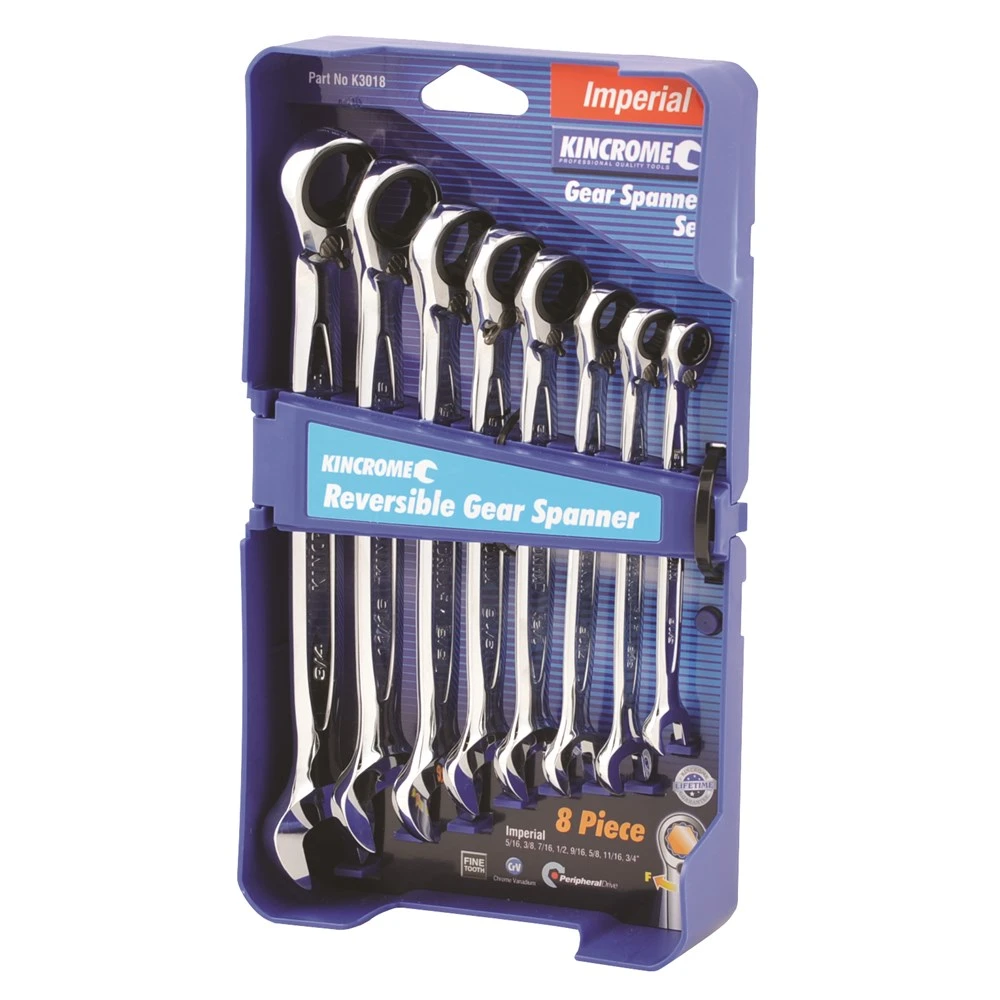 The Kincrome Gear Spanner has all the benefits of standard spanners and more. The strong fine gear ratcheting ring end needs as little as 5° of sweep to move fastener, a standard fixed ring end needs a minimum of 30°, or 6 times the area. Kincrome Gear Spanner ratcheting ring end has a Peripheral Drive™ configuration that virtually eliminates the rounding off of fasteners. The narrow and thin head, combined with fine gear tooth design makes the Kincrome Gear Spanner suitable for working in tight and hard to access areas where a ratchet and socket will not fit. Combined with the ‘Fine Tooth’ technology Kincrome Gear Spanners are the ‘state of the art’ in spanners, and come with a handy plastic storage case.