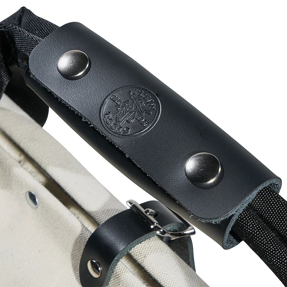 - Includes shoulder strap mounts, external pocket, leather bottom with 3” (76 mm) of the sides covered with black leather, 2” (51 mm) wide webbing handles, leather handle wrap and external tool loop handle in the webbing