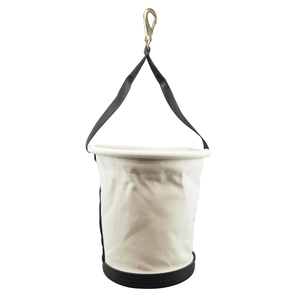 - Built to handle professional wear and tear, the Klein Tools 12” Heavy-Duty Tapered-Wall Bucket is constructed out of tough No. 4 canvas and is built for strength and durability. The web handle extends down the sides of the bucket for added strength and includes a swivel snap hook. Additionally, it features a high-density polyethylene top ring for strength and chemical resistance