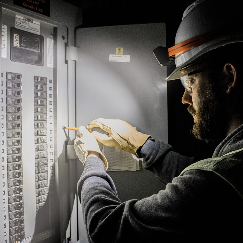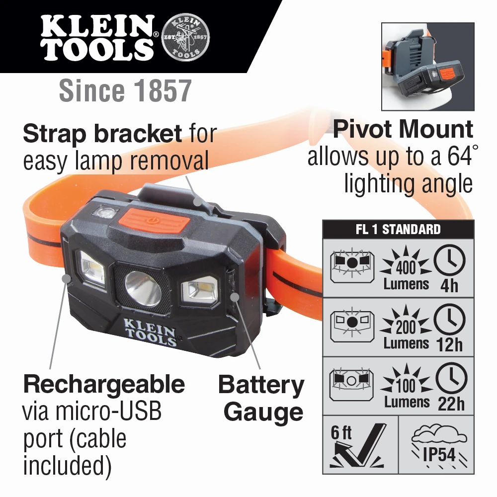 - The Klein Tools rechargeable headlamp provides three modes to fit your task: a bright, 22-hour floodlight; a brighter 12-hour focused spotlight; and a super-bright 400 lumen boost mode. You’ll know when it’s time to recharge the lamp, because the battery gauge clearly indicates how much battery power is left. Whether you wear with the adjustable silicone strap or attach it directly to a Klein® Hard Hat, this light-sensing auto-off headlamp is the best choice for your everyday light