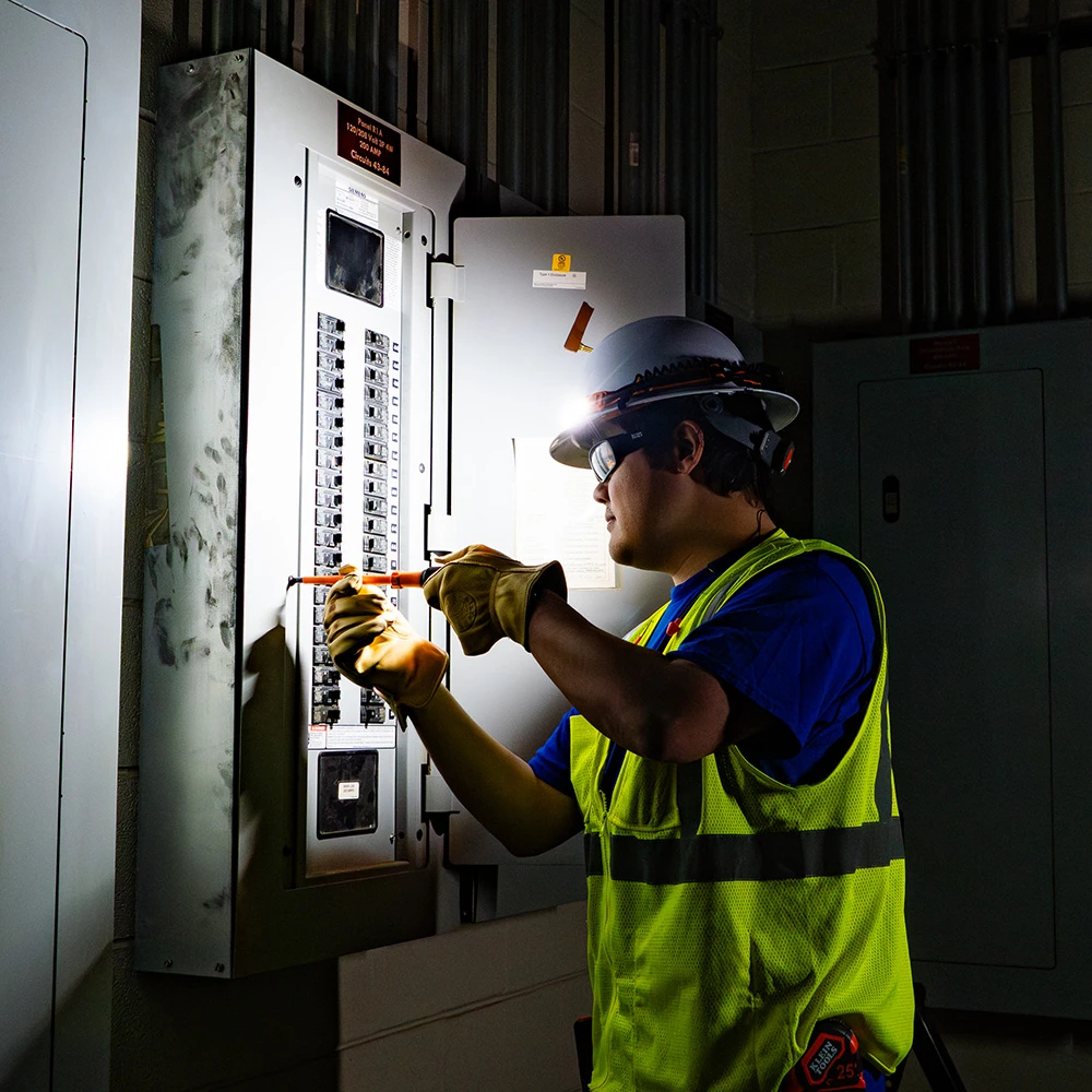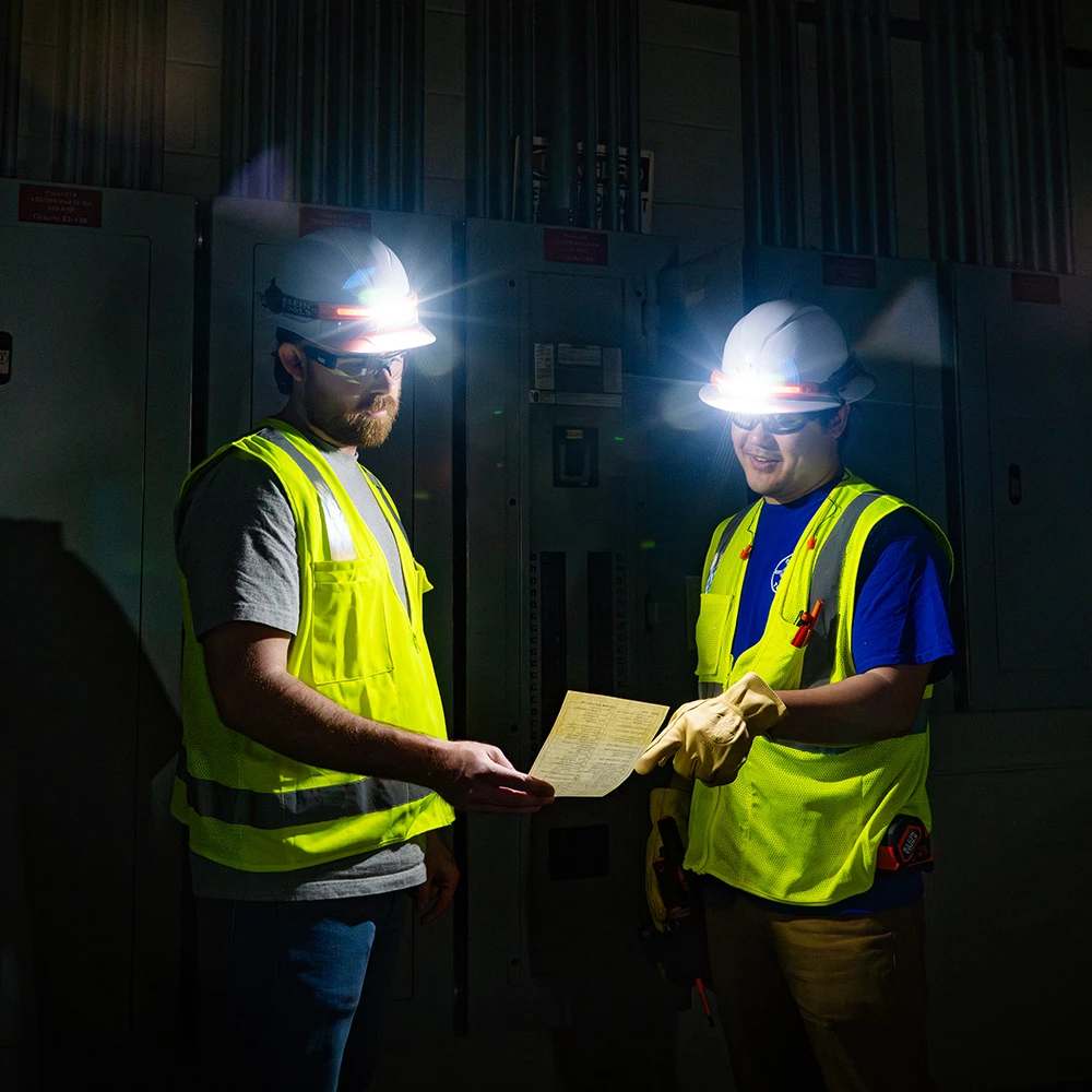 - Flexible headlamp with rear-positioned battery conforms to head or hard hats; provides balance and low profile for access in tight spaces