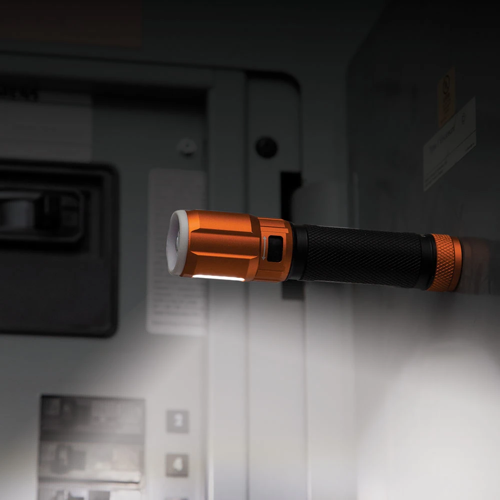 - Klein Tools rechargeable torch also works as a handy work light, with its magnetic end cap and side-barrel LEDs. This versatile light offers 5 modes in total. Smartly designed to turn back on in the same mode you last turned it off, so fewer clicks are needed to get to your favourite mode. This durable torch is IP66 dustproof and water-resistant, making it a perfect everyday light on the job site