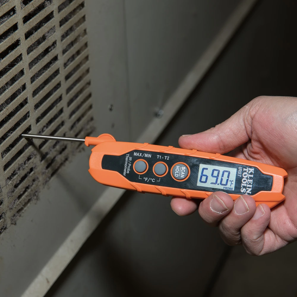 - The Klein Tools IR07 is a dual IR (infrared) thermometer and probe thermometer. This rugged pocket thermometer measures temperatures from -40 to 572-Degrees Fahrenheit (-40 to 400-Degrees Celsius) for both IR and probe measurements. The IR thermometer has a Distance-to-Spot ratio of 8:1 and the target laser can also be used as a laser pointer. The probe accurately measures air, liquid and surface temps and has a convenient hook for hands-free indoor measurements. The IR07 quickly calculates the differential temperature (T1-T2) and has a backlit LCD for easy viewing in low light