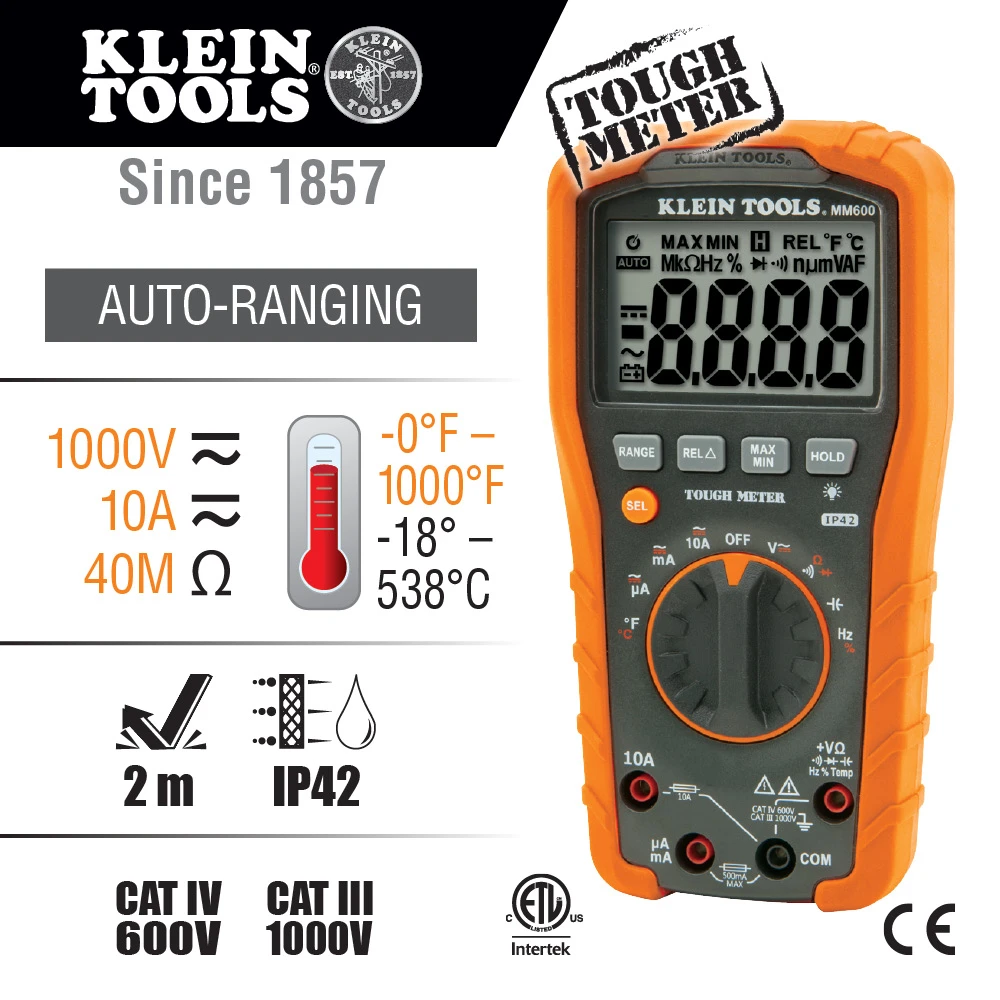 - The Klein Tools MM600 Multimeter is an automatically ranging digital multimeter that measures AC/DC voltage, AC/DC current, and resistance. It can also measure temperature, capacitance, frequency, duty-cycle, test diodes and continuity. Exclusively designed from the ground up by electricians for electricians. Years of field research, combined with extensive input from electricians across America, inspired the development of meters loaded with innovative, time-saving features