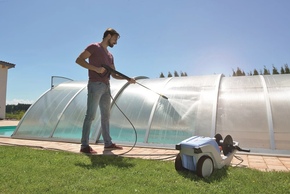 - Built in accessory storage, integrated hose reel & 15m HP hose, total-stop auto switch off function and low pressure detergent application