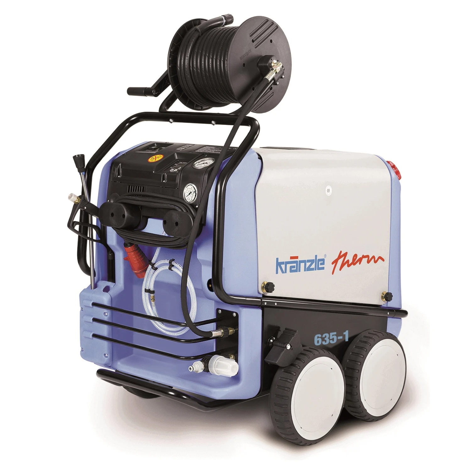 - Kranzle Therm 635-1 Top of the range 240V Hot Water high pressure cleaner in terms of safety, performance, reliability and low cost of operation. Designed and built to outlast and outperform anything else. Standard features include Total- Stop automatic control system with delayed motor cut-out, optical flame monitoring, low fuel cut-out, hour meter, adjustable burner performance, thermal overload switch, thermostat regulation ˚C, 4-way safety system and built in park brake. Ideal for regular use in applications like heavy machinery, transport and manufacturing plants