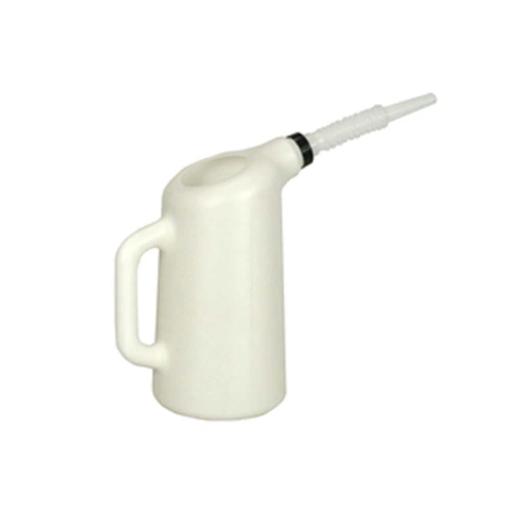 Translucent polyethylene material enables the user to read the liquid level on the container. Marked in both quarts and liters. The flexible 8″ pouring spout enables easy transfer of liquid. The spout is white.