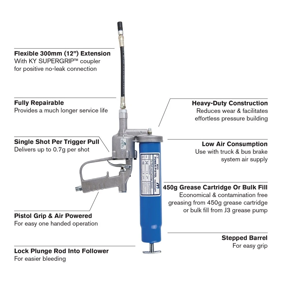 - The K53 POWERPISTOL™ is an air-powered single shot grease gun that combines portability with effortless one handed operation. Low air consumption makes the K53 POWERPISTOL™ ideal for use with truck and bus brake system air supply. Air powered requires much less effort to operate. Heavy duty pistol grip construction with comfortable ergonomics to suit 450g grease cartridges, bulk filling or Macnaught J3 grease transfer pump loading. The K53 POWERPISTOL™ is fully repairable with a strong die cast head and heavy gauge steel barrel for extra long service life.