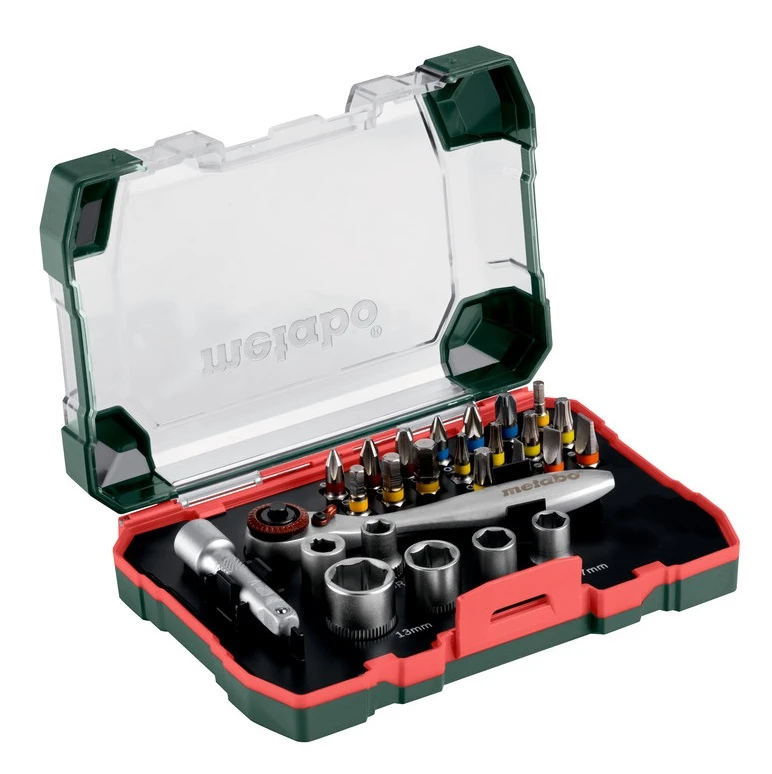 - Bits made of chrome vanadium steel (S2 quality); bits with colour coding: for faster and simpler detection of the suitable bit; high-quality ratchet; socket wrench made of chrome vanadium steel; high-quality, robust box in special Metabo design, with Euro hole hanger
