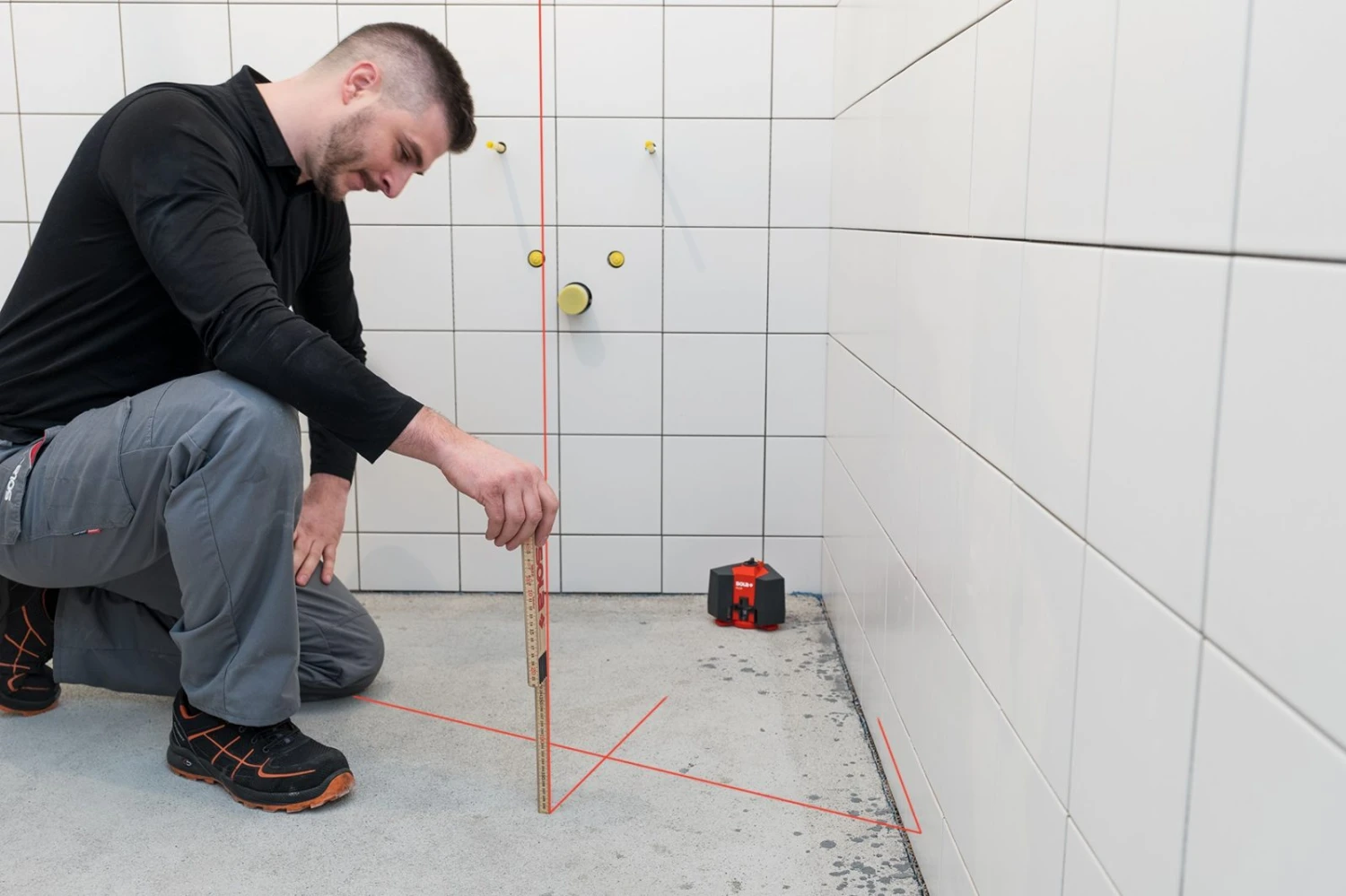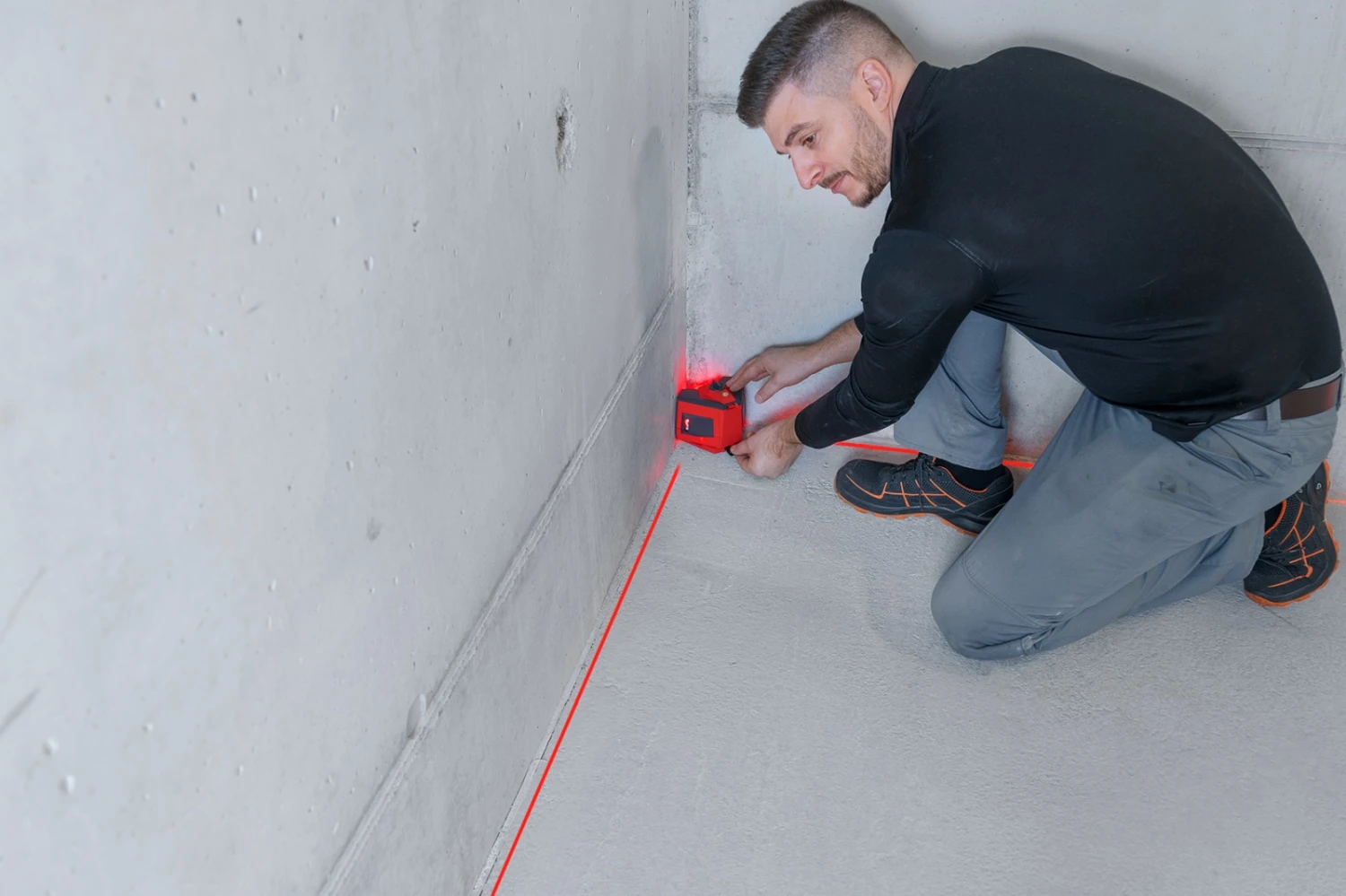 - The device can also be used to quickly and easily check that floors are level thanks to its horizontal laser line, which is beamed just above the ground. The floor’s properties can then be calculated using a folding rule. By directing the laser’s floor lines close to a wall, users can easily check that the wall is perpendicular