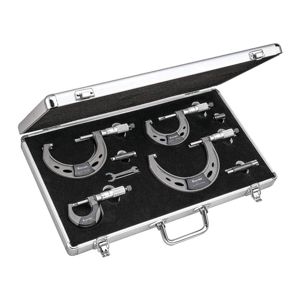 - The Starrett S444.1 Metric Outside Micrometer Set includes 25mm, 50mm, 75mm, and 100mm micrometers, three standards, adjusting wrench, in case. A popular precision micrometers used by skilled workmen worldwide. This model features 0-100mm Measuring Range. Smooth friction thimble for uniform pressure, the combination ratchet and speeder for uniform pressure and quicker adjustment, or a plain micrometer that depends on your own “feel”. Recommended for mechanics, automotive service and machine shops, toolrooms, inspection departments and wherever gaging involves a wide range of measurements