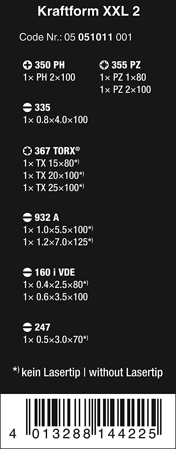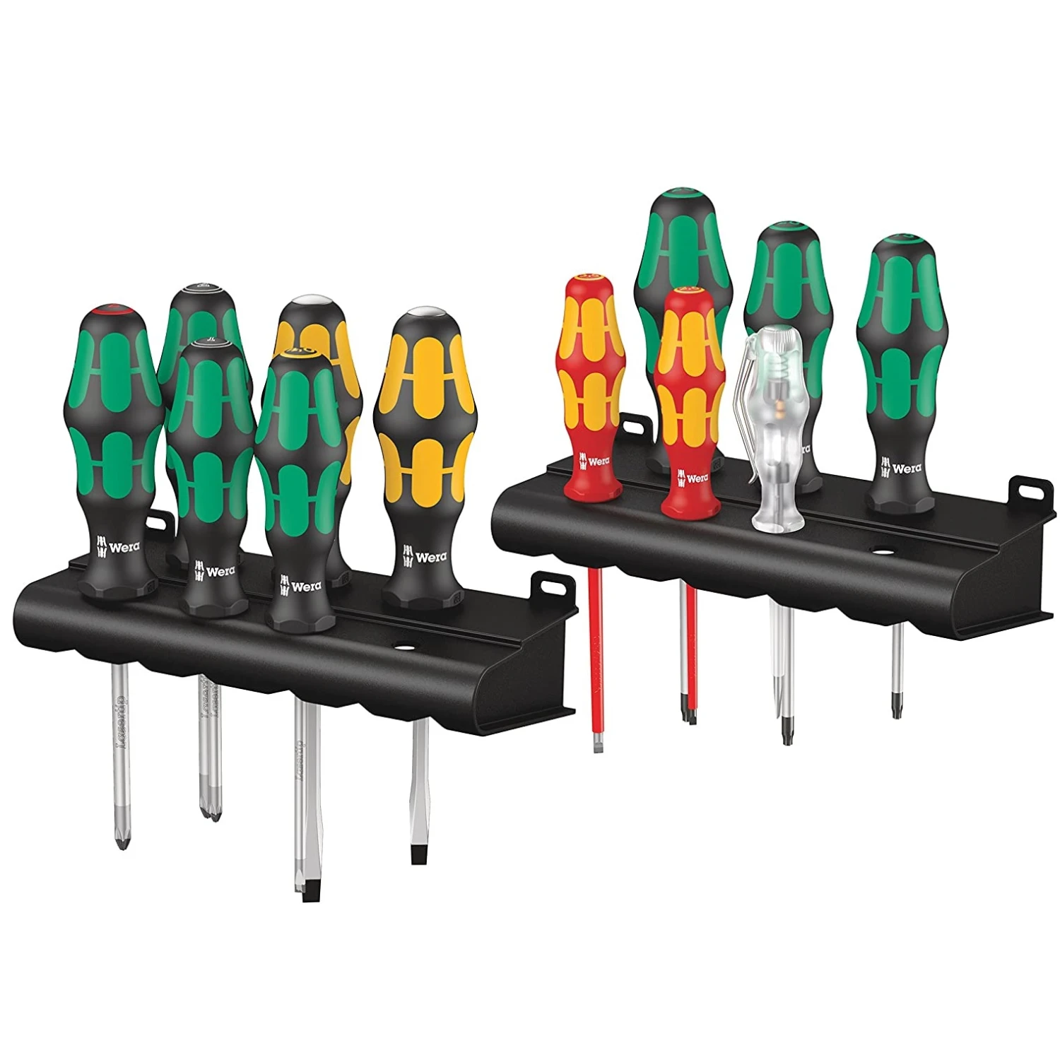 - Wera 12-piece all-round screwdriver set. Kraftform Plus handle for pleasant, ergonomic working that prevents blisters and calluses. Hard gripping zones for high working speeds whereas soft zones ensure high torque transfer. Partially with Lasertip: The tips of the Wera Lasertip screwdrivers are microscopically roughened by laser beams. This rough surface literally bites into the head of the screw. Any unintentional slipping out is therefore a thing of the past. “Take it easy” tool finder with colour coding according to profiles and size stamp – for simple and rapid accessing of the required tool