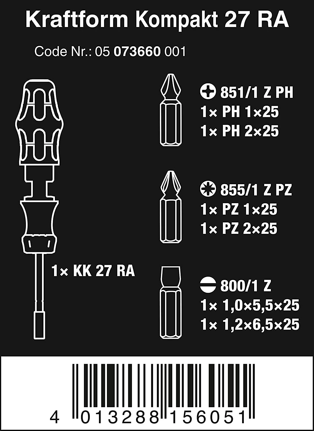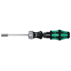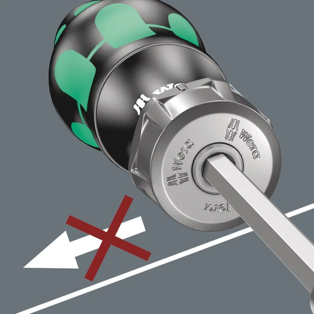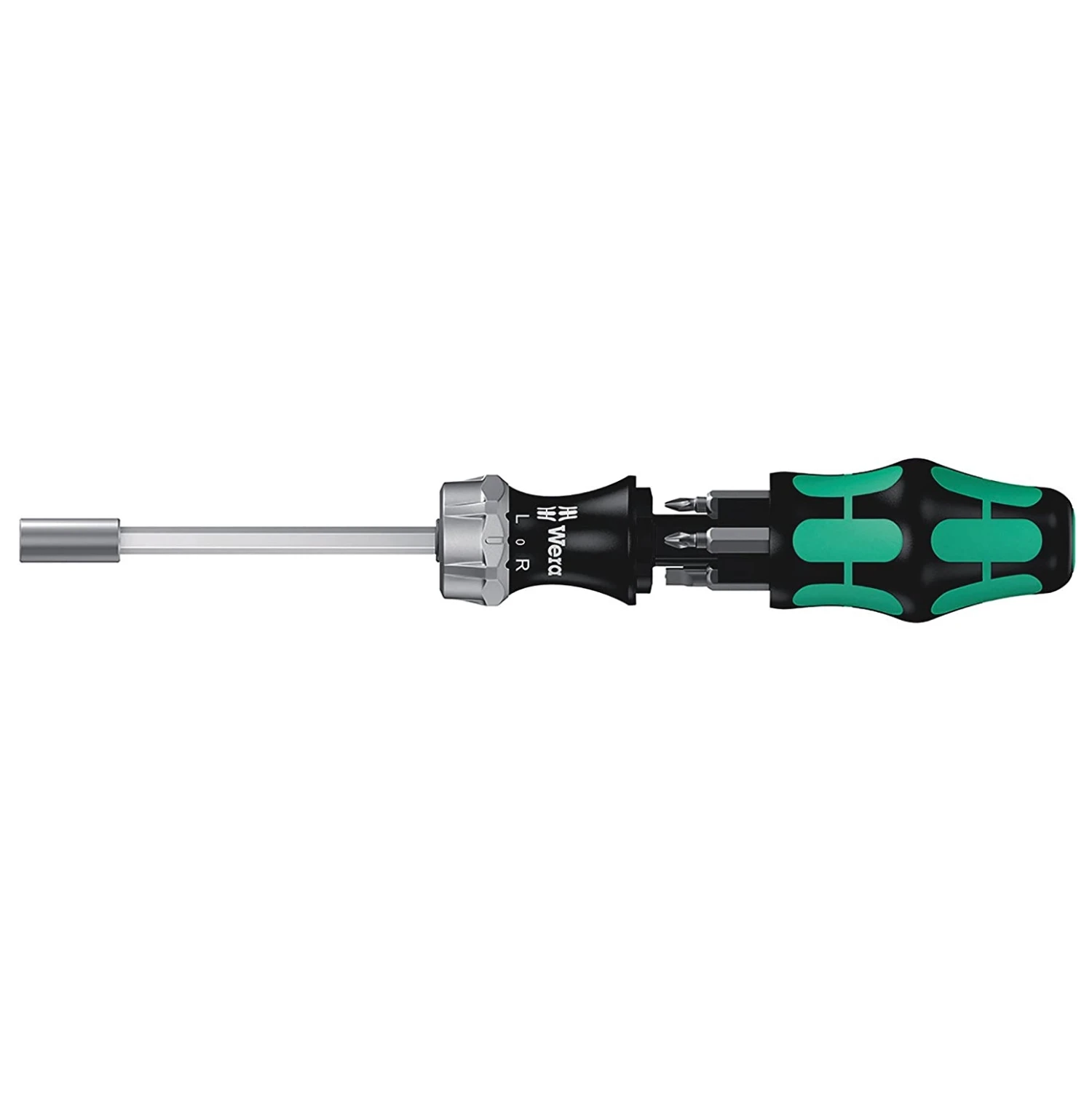 - Wera compact tool with multi-component Kraftform handle for high working speeds and particularly ergonomic screwdriving. Integrated bit magazine in the handle. Includes ratchet: fine-pitched for small return angle, switchover ring (right, fixed, left), maximum torque of up to 50 Nm; hexagonal blade with ¼” hexagon socket take-up, stainless sleeve, strong permanent magnet